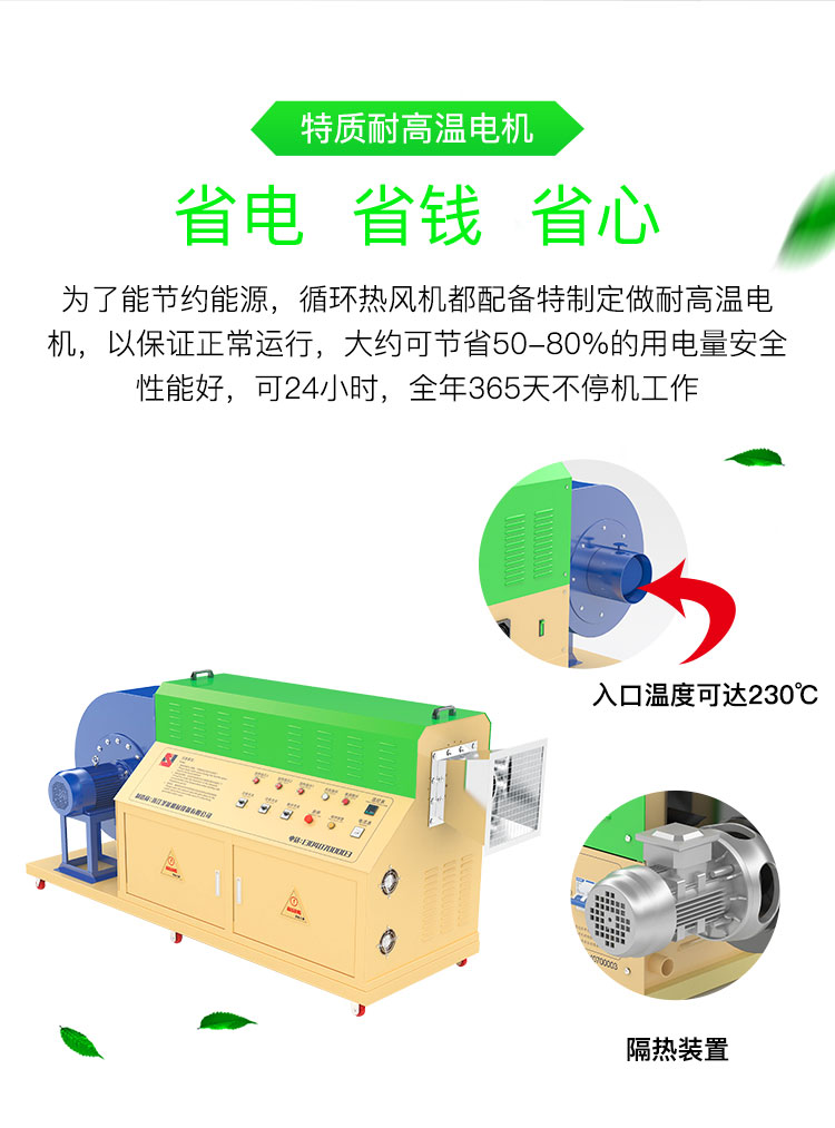 ④為了節約能源,循環型系列熱風機都配備特制定做耐高溫電機,以保證正常運行,大約可節省50-80%的用電量。