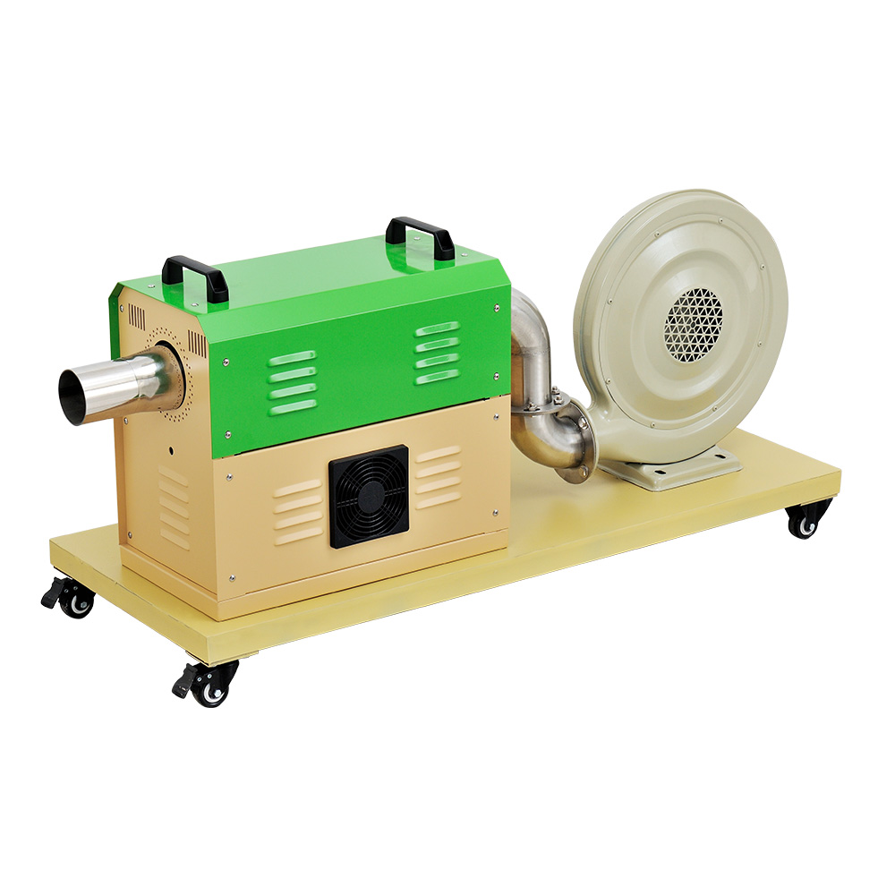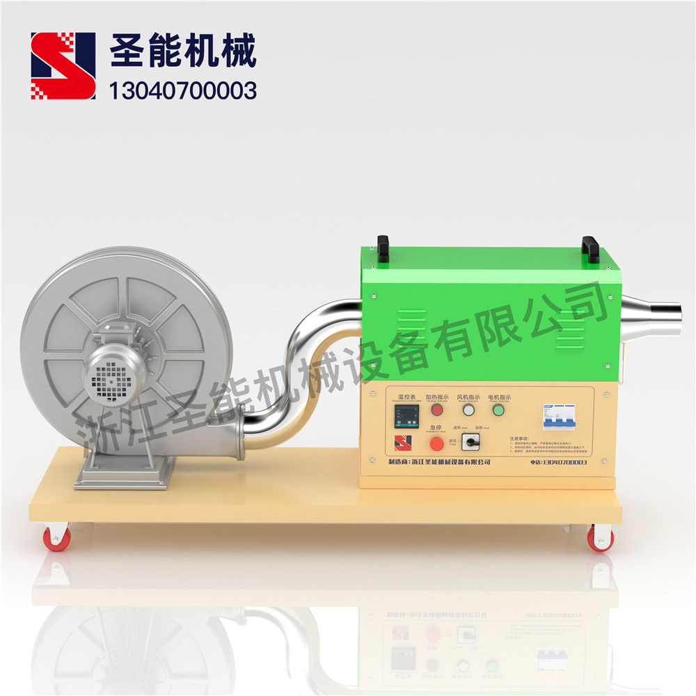 “TSN”工業(yè)熱風機主要由送風系統(tǒng)、加熱系統(tǒng)、溫控系統(tǒng)三大部分部分組成。通電后,鼓風機把空氣吹送到加熱器里,令空氣從螺旋狀的電熱絲內(nèi)、外側(cè)均勻通過,電熱絲通電后產(chǎn)生的熱量與通過的冷空氣進行熱交換,從而使出風口的風溫升高。出風口處的K型熱電偶及時將探測到的出風溫度反饋到溫控儀,儀表根據(jù)設定的溫度檢測著工作的實際溫度,并將有關信息傳遞回固態(tài)繼電器進而控制加熱器是否工作。同時,鼓風機可利用風量調(diào)節(jié)器(變頻器、手動)調(diào)節(jié)吹送空氣的風量大小。另外,送風系統(tǒng)及加熱器,均有過載超溫自動保護裝置,總電路也設計了緊急摯,以保證安全,防止錯誤操作。